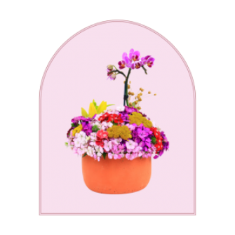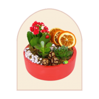 1 adet siyah beton saksı3 adet kırmızı gül1 adet lahana çiçeği3 adet beyaz papatya3 adet yeşil top krizantem3 adet kuru portakalOkaliptusOasis..