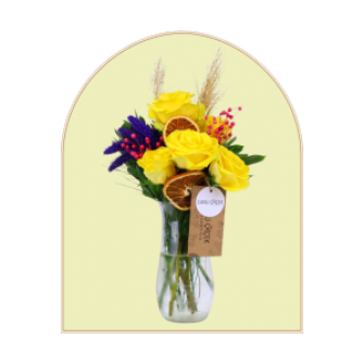 Cam vazoSarı GüllerKuru portakalKuru çiçeklerRuskos yaprağı..